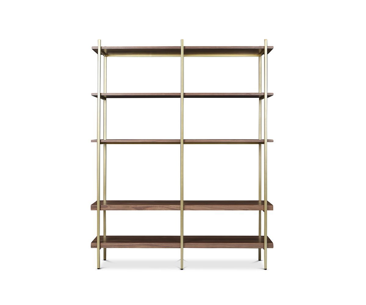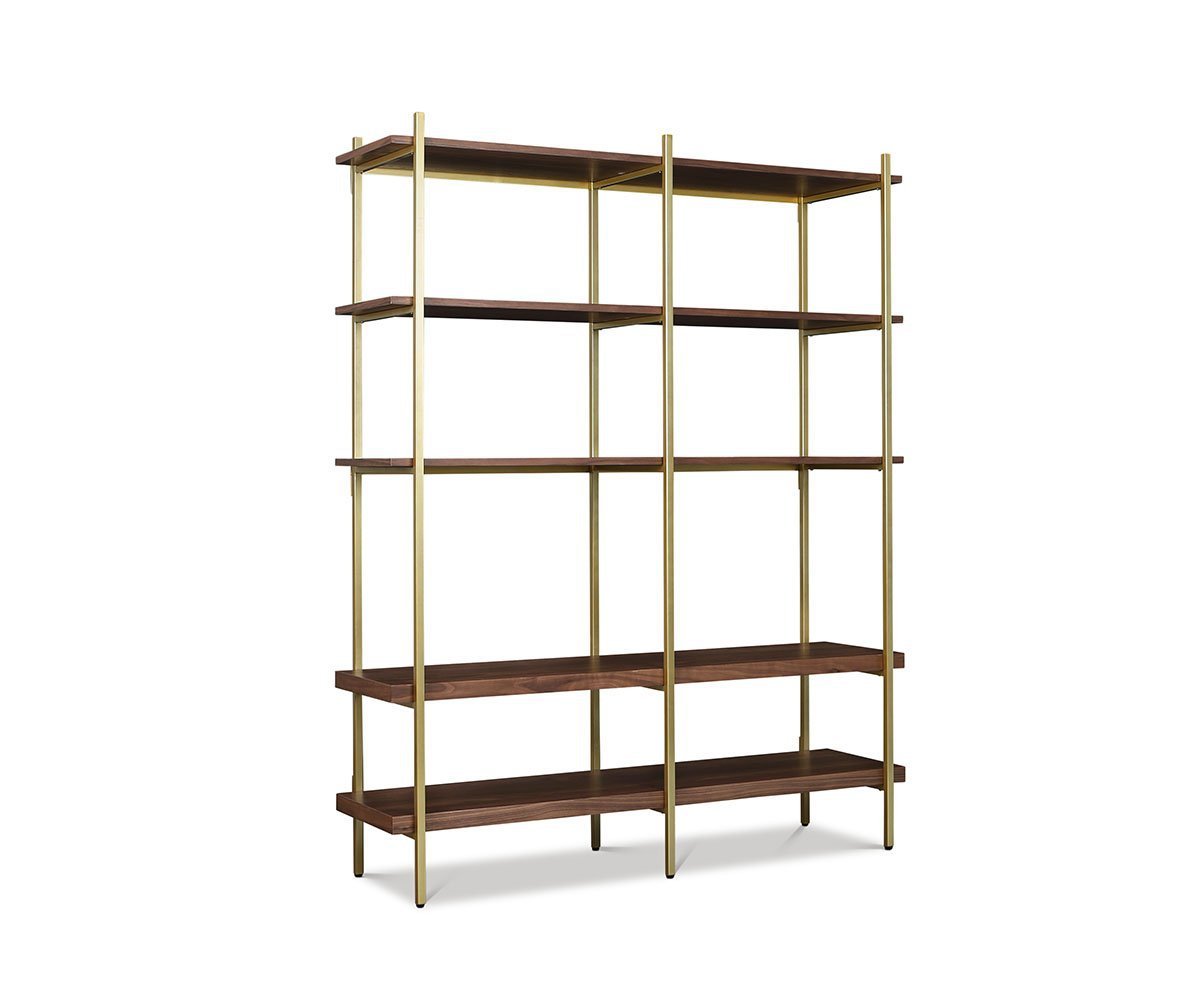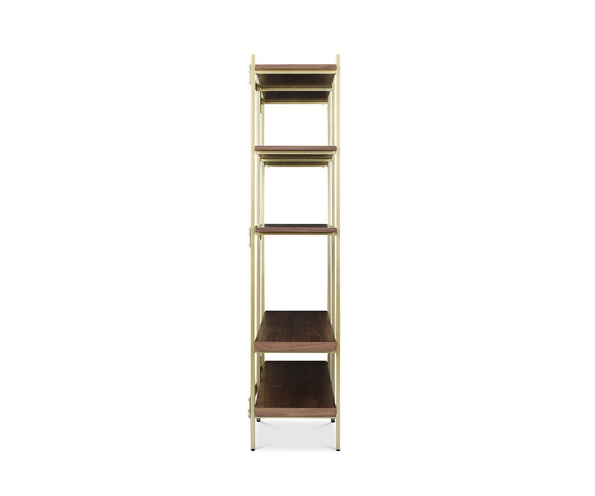 The Kallan bookcase features a simple, sleek modern design that fits in nicely in many settings. When the need for storage arises, let the shine of the brass frame and warmth from the gorgeous wood grain pattern of the shelves enhance the room of your choice. This substantial piece allows you to proudly display treasures of various sizes and create an neatly organized space.