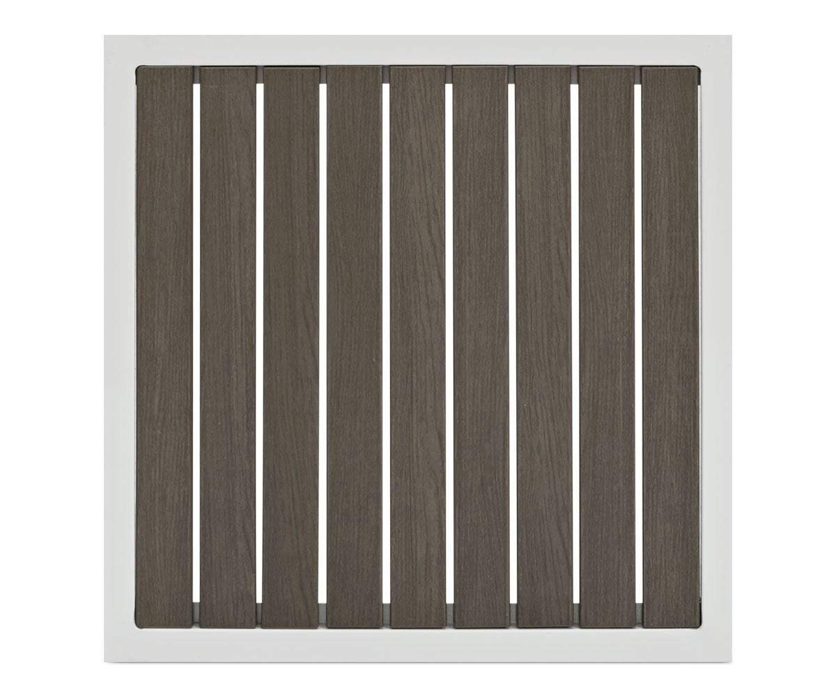 The Aurora end table features a white powder-coated aluminum frame with a tabletop of resin wood slats. Both durable and lightweight, it is designed for use season after season. This accent piece is large enough to serve multiple purposes, yet small enough to tuck into small spaces.