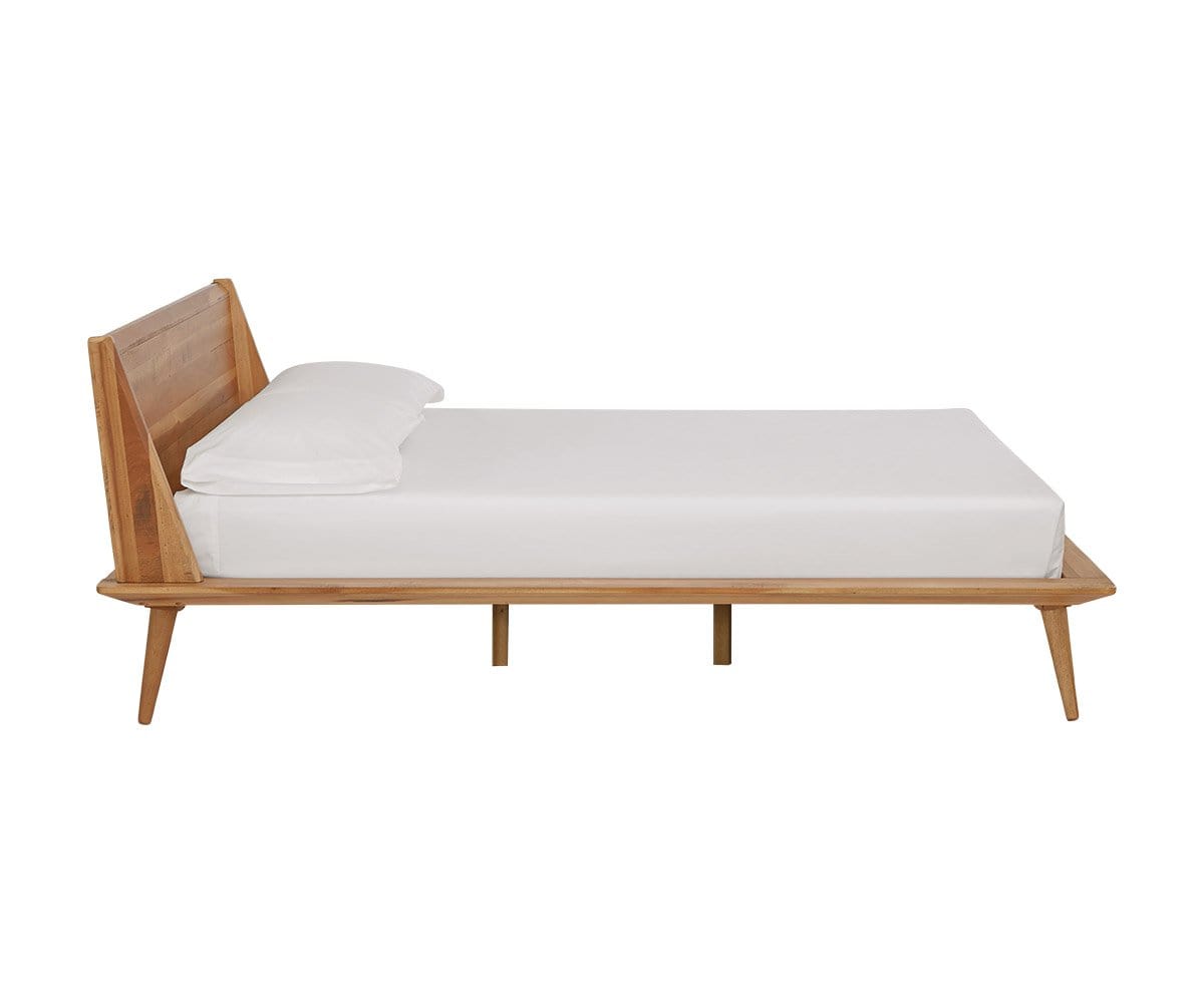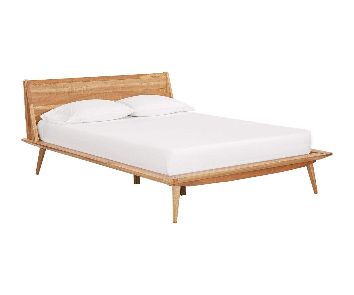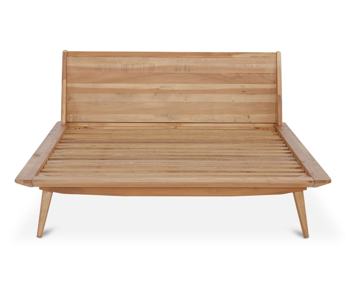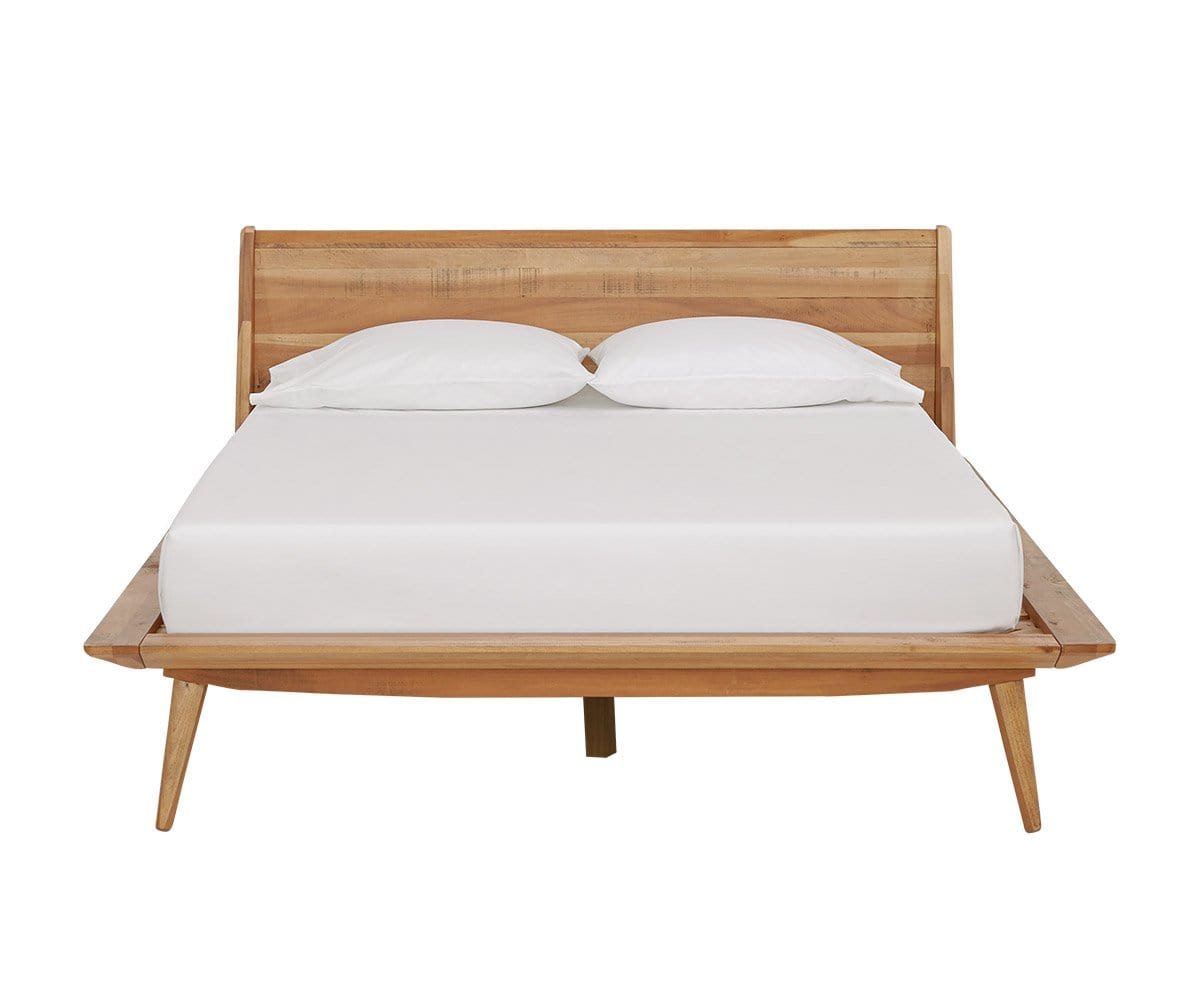 The Nordic-inspired Bolig bed features a unique and iconic silhouette crafted from solid American poplar with a distressed finish. Weaving mid-century modern style into the design, this bed features pleasing angles and striking tapered legs. The rustic reclaimed look of this collection is achieved through an intentional distressing technique that applies burn and saw marks to the surface while retaining and highlighting natural characteristics in the wood. This technique results in a reclaimed driftwood appearance, which adds personality and a one-of-a-kind uniqueness to each piece.