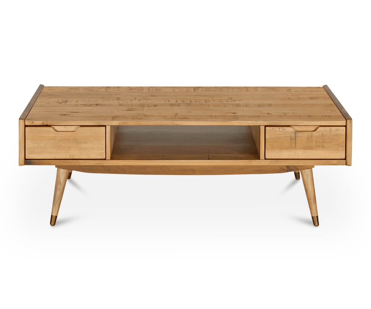 Command attention with the Bolig coffee table. Four round, tapered legs with brass capped feet support the stout unit crafted from solid American poplar with a distressed finish. Two drawers and an open niche are perfect for storing remotes, coasters and other miscellaneous items in this Scandinavian charmer. The rustic reclaimed look of this collection is achieved through an intentional distressing technique that applies burn and saw marks to the surface while retaining and highlighting natural characteristics in the wood. This technique results in a reclaimed driftwood appearance, which adds personality and a one-of-a-kind uniqueness to each piece.