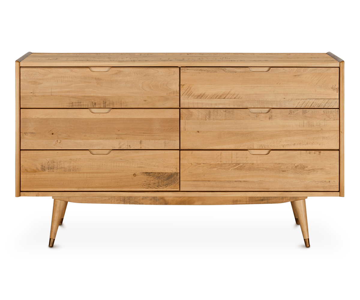 The epitome of Scandinavian design, the Bolig double dresser provides you with ample storage for your wardrobe with six large drawers that feature uniquely carved drawer pulls. This dresser is crafted from solid American poplar with a distressed finish and features gently angled, tapered legs with brass capped feet. The rustic reclaimed look of this collection is achieved through an intentional distressing technique that applies burn and saw marks to the surface while retaining and highlighting natural characteristics in the wood. This technique results in a reclaimed driftwood appearance, which adds personality and a one-of-a-kind uniqueness to each piece.
