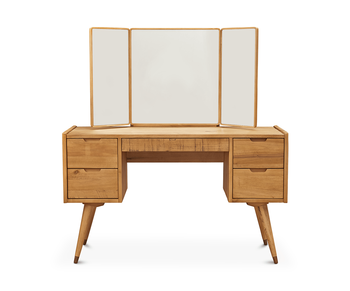 Simple Scandinavian character shines through in the Bolig folding vanity mirror framed in solid American poplar with a distressed finish. Completed with rounded corners and covered back panels, this desktop/vanity top piece adds light and function to your space. The rustic reclaimed look of this collection is achieved through an intentional distressing technique that applies burn and saw marks to the surface while retaining and highlighting natural characteristics in the wood. This technique results in a reclaimed driftwood appearance, which adds personality and a one-of-a-kind uniqueness to each piece.