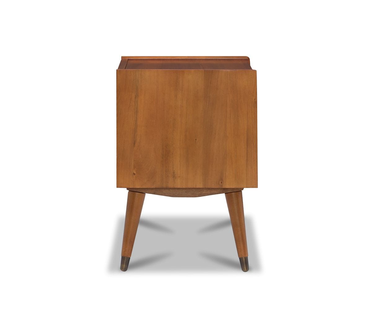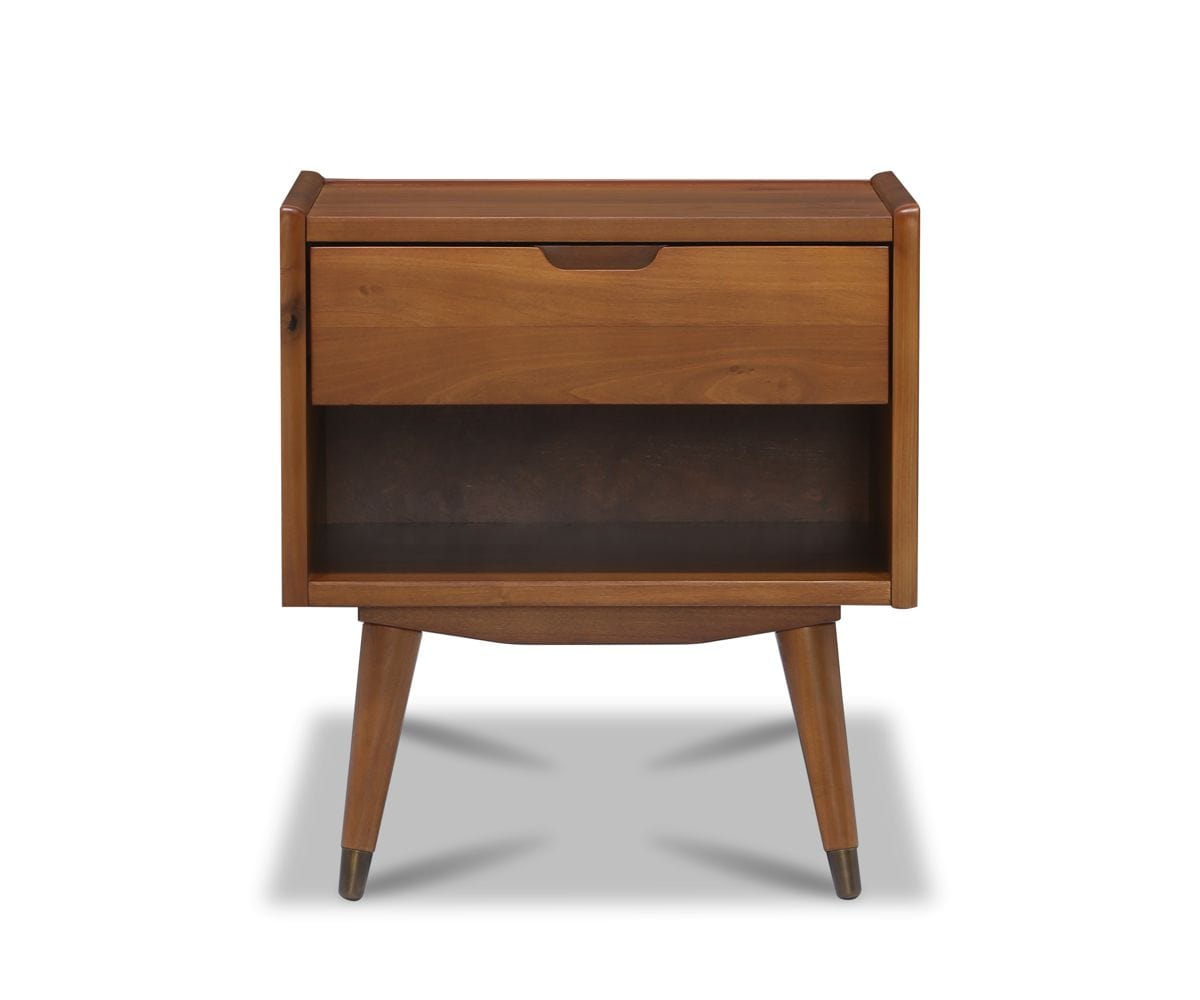 The Bolig nightstand gets a whole new look with a light walnut finish that's smooth to the touch. Every detail is quintessentially mid-century, with minimal lines, angled, tapered legs and brass capped feet. An open shelf design and single drawer provide just the right amount of bedside storage, while the clean, carved drawer pull evokes a Scandi sensibility. Your mid-century modern dreamspace is complete.