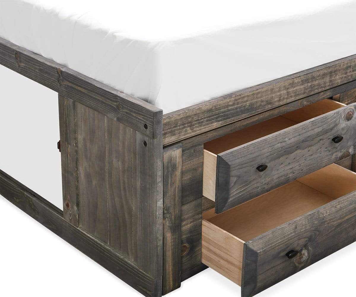 An adventurous profile and versatile storage make the Brennan captain's bed a can't-miss. This piece features a built-in bookcase (hello, favorite reading spot!) and storage drawers (hurrah for space-saving!). Plus, two side doors let you stash bedding beneath the mattress. It's crafted with a solid Northern California pine frame and finished with a grey driftwood stain, making it easy to sand and refinish if the surface is nicked. Available in Full and Twin sizes.