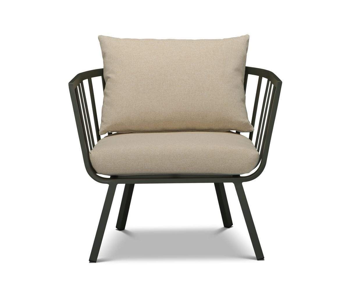 Designed for basking in the sun. Created for warm-weather fun. The Del Carmen arm chair makes summer days that much more relaxing. It starts with the sturdy aluminum frame, which features a dark green powder coat to evoke lush island vibes. The beige cushions offer picture-perfect visual contrast for that quintessential jungalow look. Best part? The cushion's feature Olefin outdoor fabric, which boasts a color fastness rating of 7-8 for powerful fade-resistant performance. It's also water-repellent, stain-resistant and mildew-resistant.