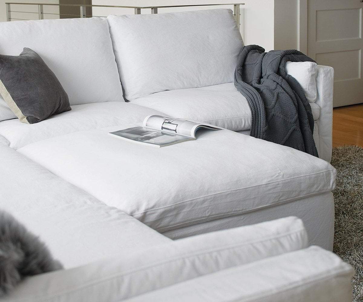 Soft, sizable and comfy, the Dream ottoman is a wonderful complement to your living room decor. Part of the Dream collection, it is wrapped in luxurious 100% upcycled denim fabric and pairs perfectly with the sectional and sofa to extend your relaxation. Its top, filled with a feather blend, is equally comfortable as a footrest or an extra seat.