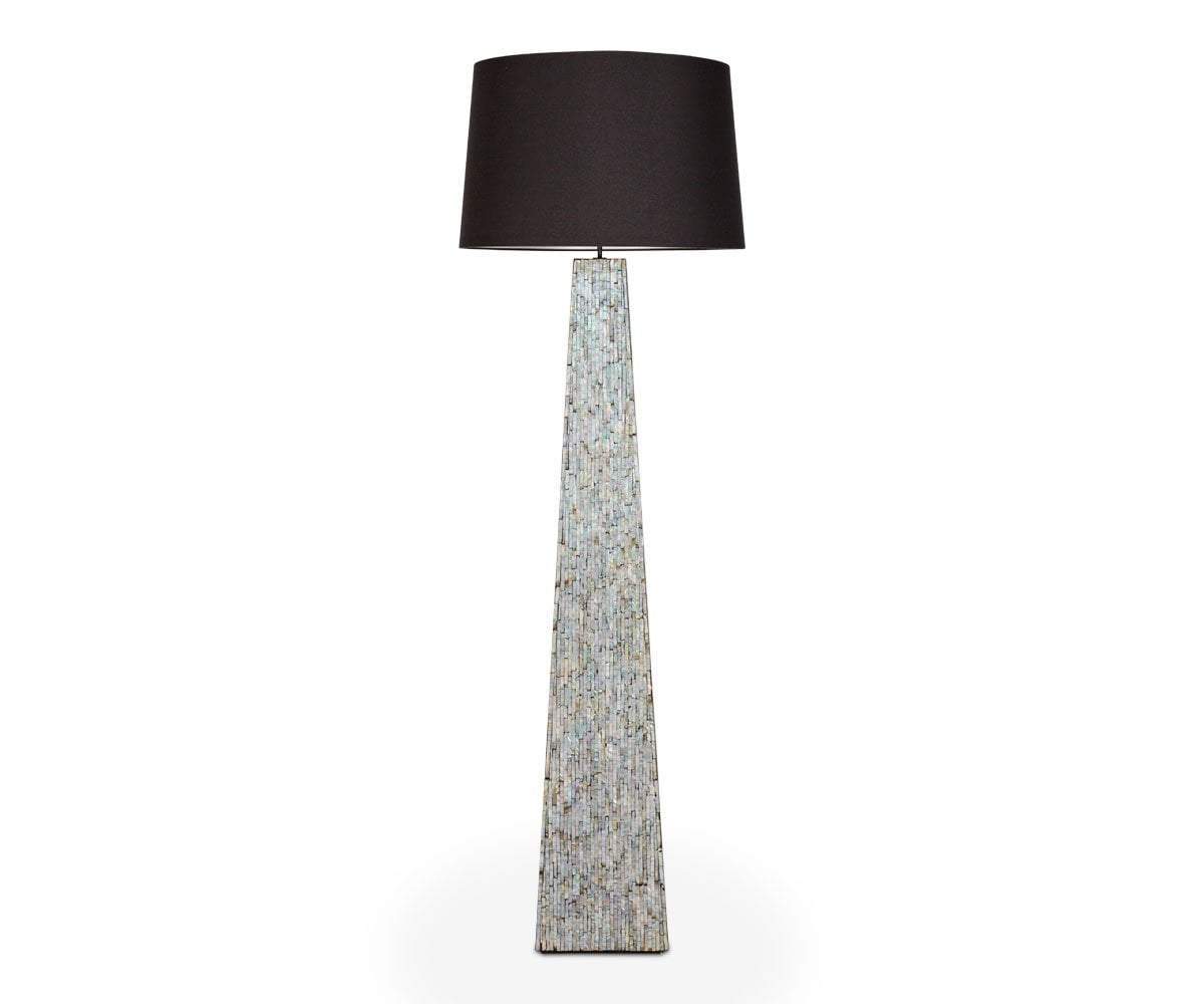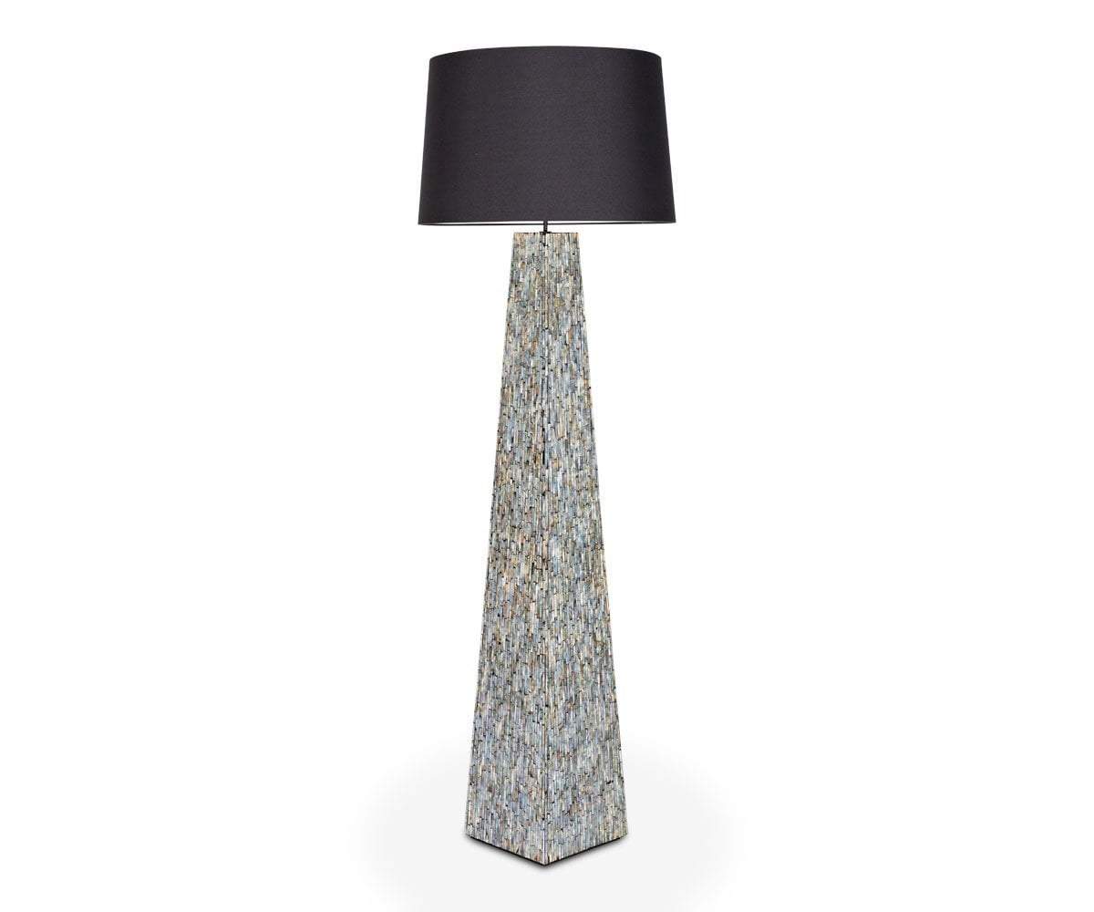 Shed light on good design with the Drumon floor lamp. The architectural base is reminiscent of the ancient pyramids and crafted with a beautifully textured line pearl. A black drum shade completes the look.