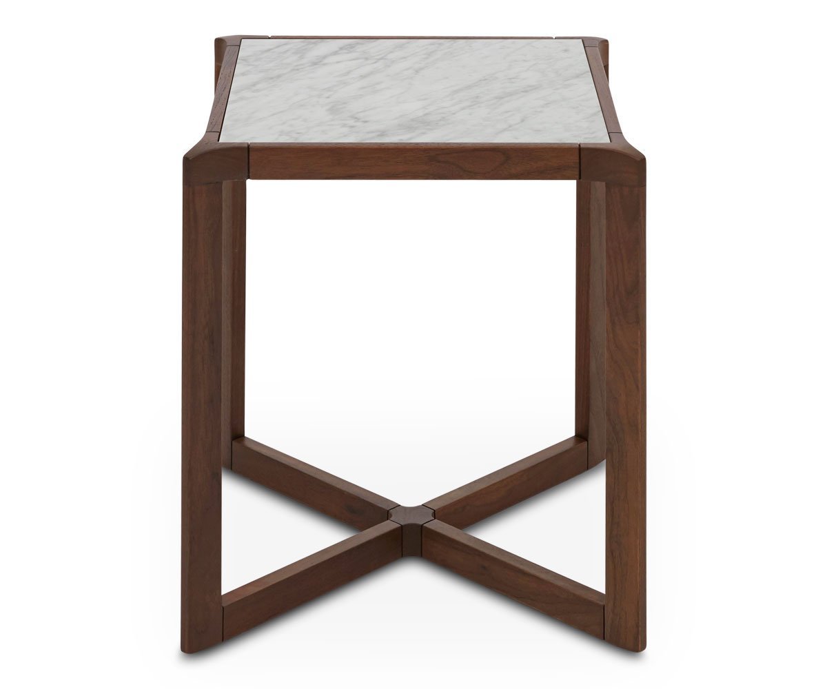 Intriguing design is introduced in the Eira end table with geometric shapes established by the solid walnut legs and embedded white marble top. So much more than an accent piece, it is both durable and eye-catching from every angle as it serves to complement your living or family room decor.