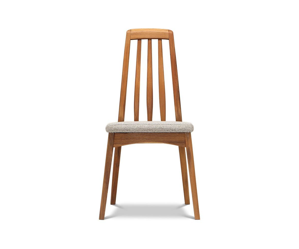 The Evon dining chair pairs well with contemporary, modern and transitional decor. The high slatted backrest and curved aprons contrast with the straight legs. It’s crafted with a teak wood frame and cushioned fabric seat.