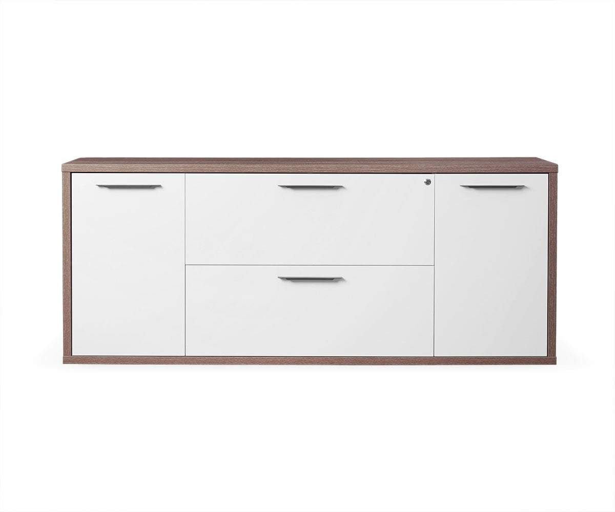 Made in Italy from eco-friendly materials, the oak wood finish of the body contrasts beautifully with the white high gloss drawer and door fronts of the Gammel credenza. A modern storage addition to your office or living space, it features two massive drawers and two side cabinets, each with an adjustable shelf. This versatile piece is designed for function with an understated style that allows it to blend into any environment.