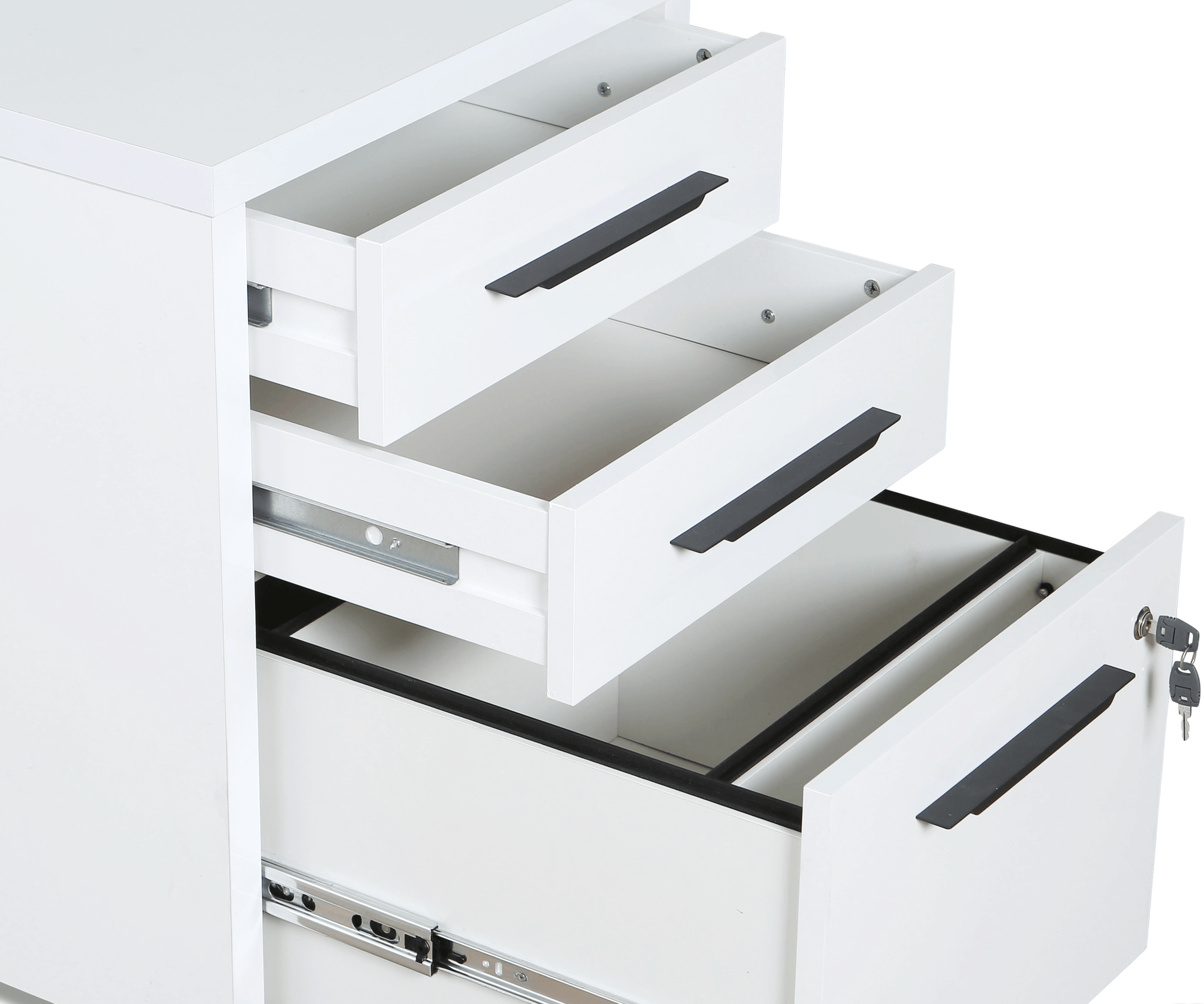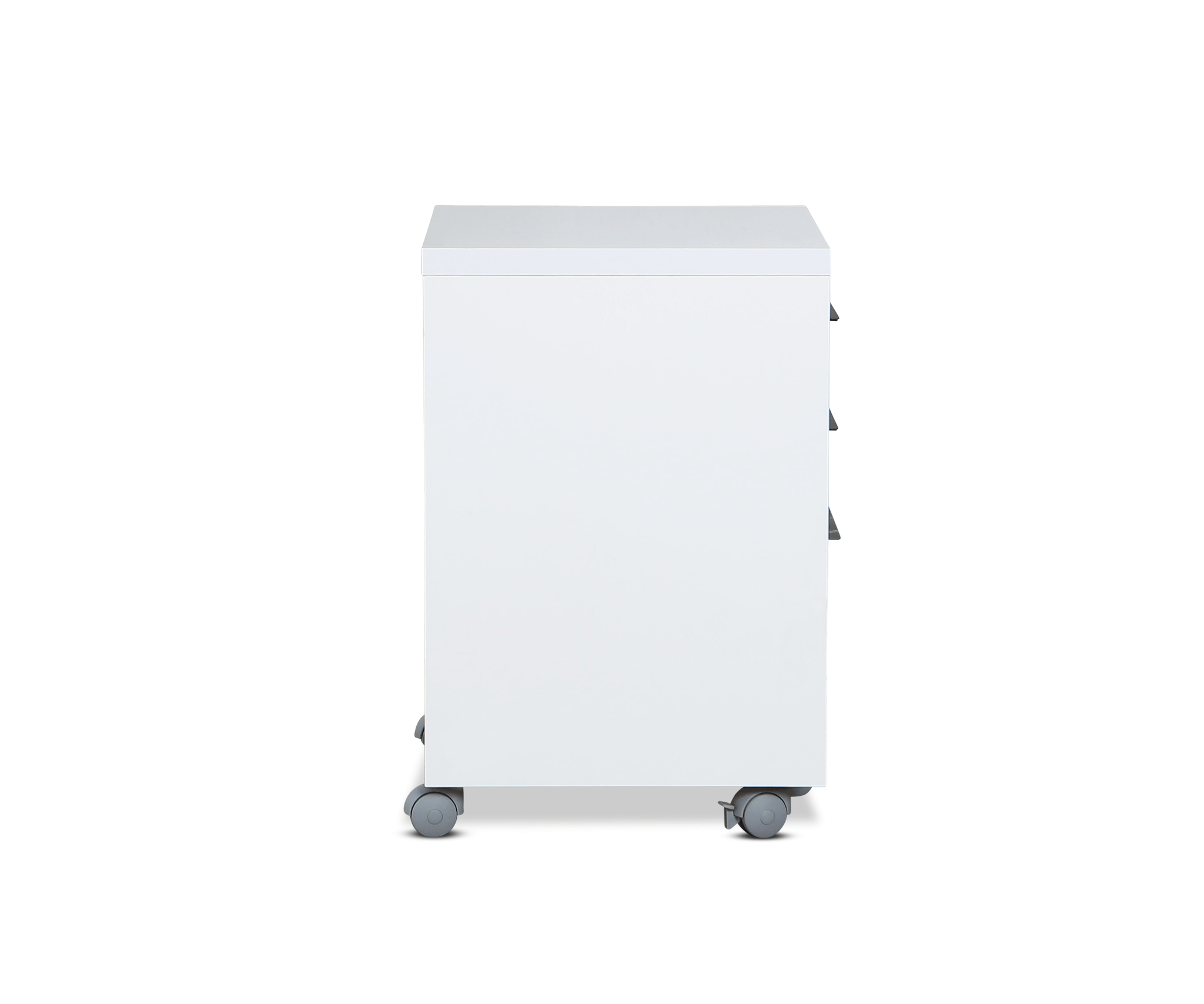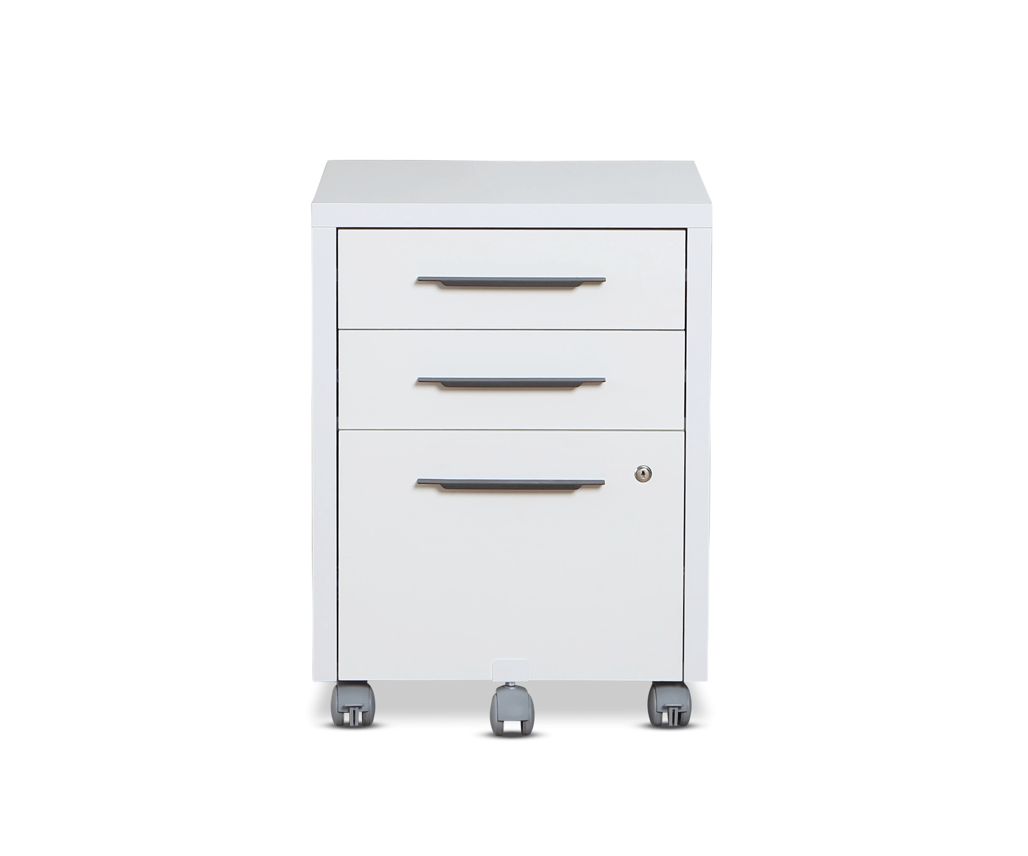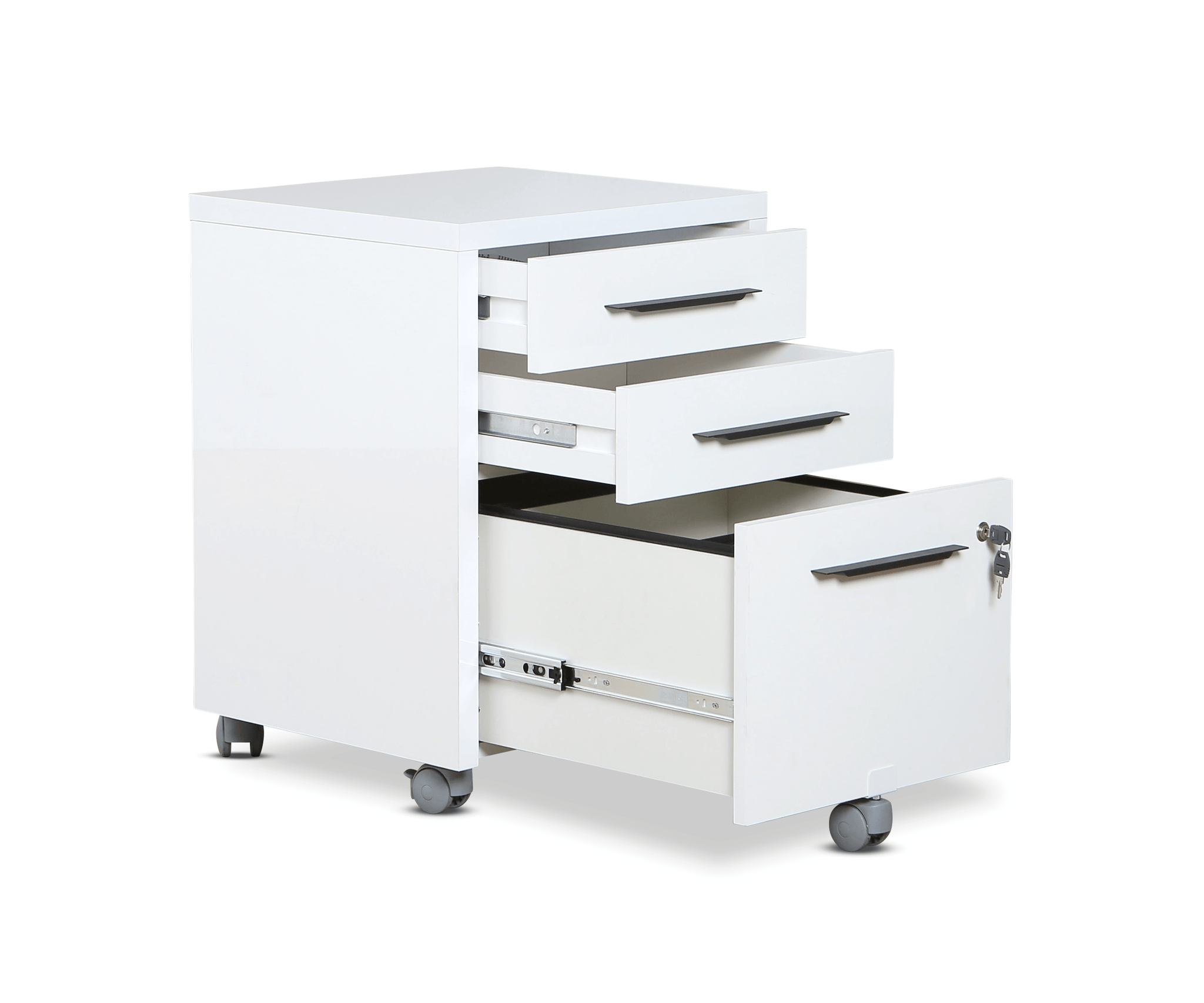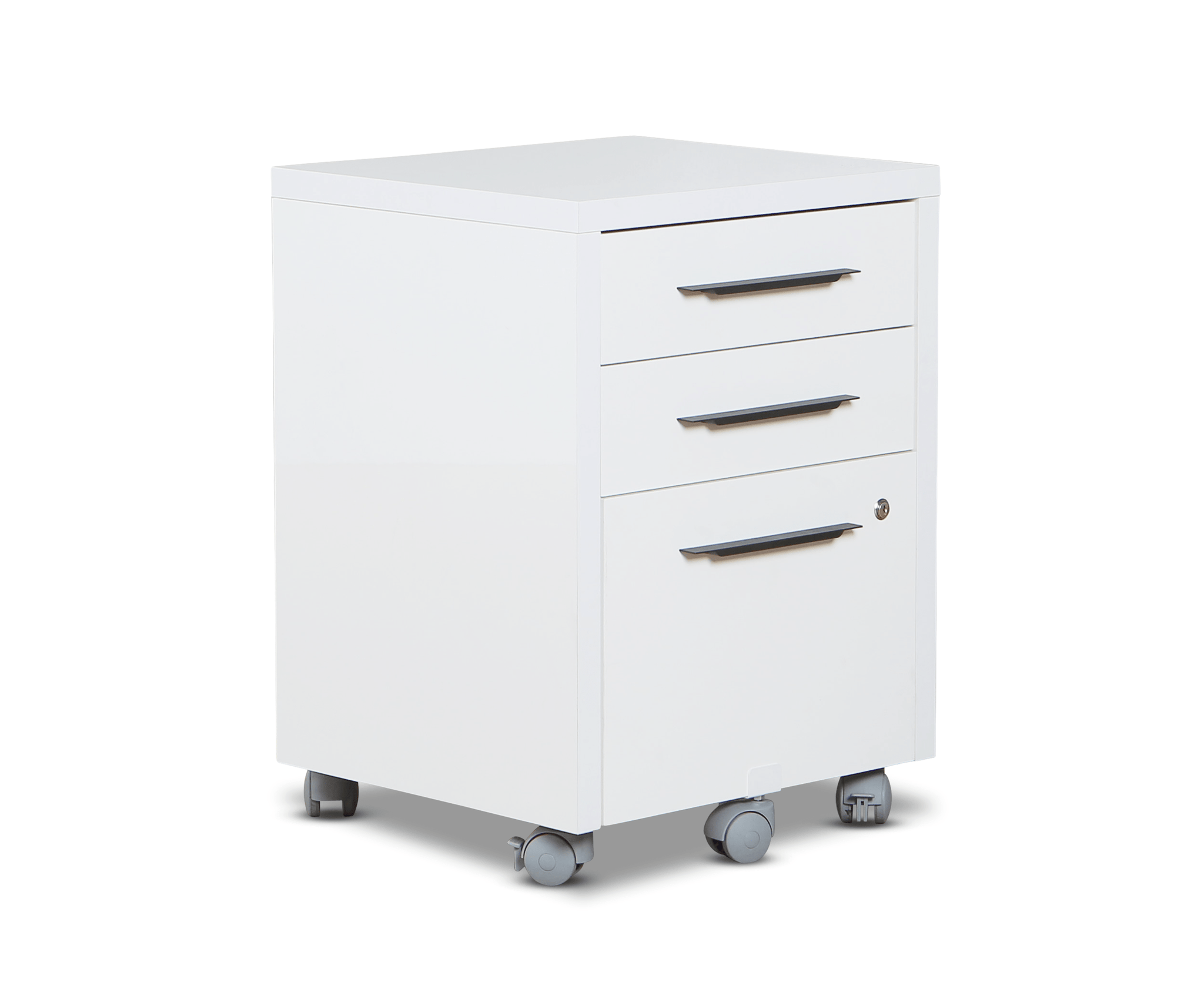 The Gammel mobile file pedestal offers organization and storage space for any office setting. Made in Italy from eco-friendly materials, the solid white finish with sleek metal drawer pulls complements any setting. The bottom file drawer locks for privacy; notice it even has a caster wheel for easy opening and to aid with stability.
