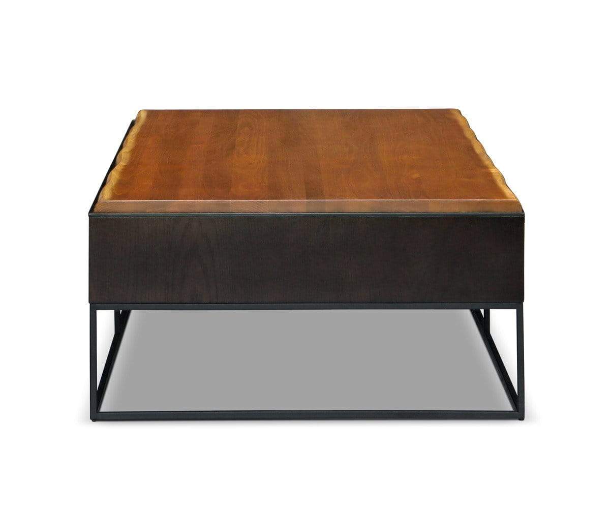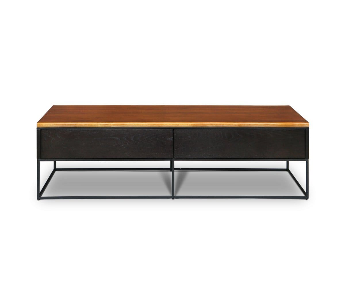 The Hasse coffee table is ideal for the center of your seating area. It features a large tabletop for your entertaining needs. Two large drawers on one side stash essentials, while open shelving on the opposite side offers extra storage. An airy black metal frame elevates the solid American poplar frame and drawers for a rustic industrial look. A rich timber brown stain enhances the wood grain.