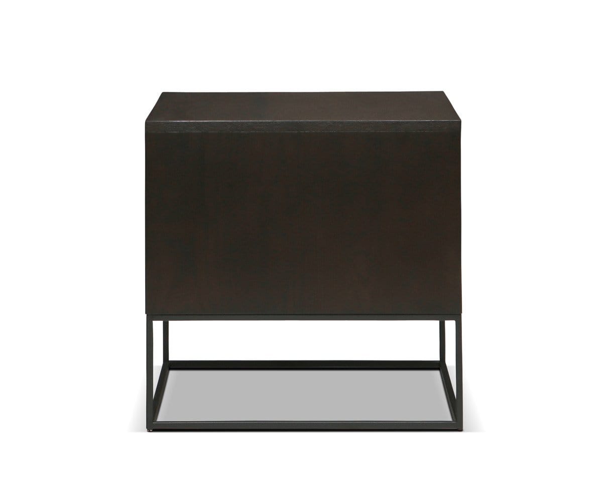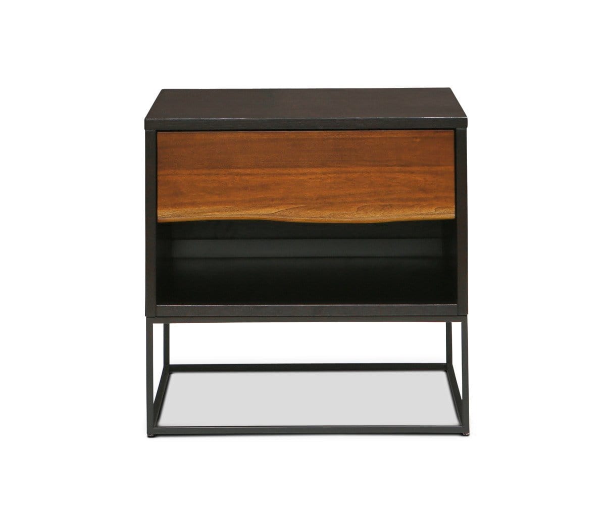Clean lines and a dynamic profile define the Hasse end table, giving it a rustic industrial feel. The box frame and drawer is crafted with solid American poplar wood and oak veneers. The frame features a black finish to compliment the airy black metal base. An open shelf provides additional storage space.