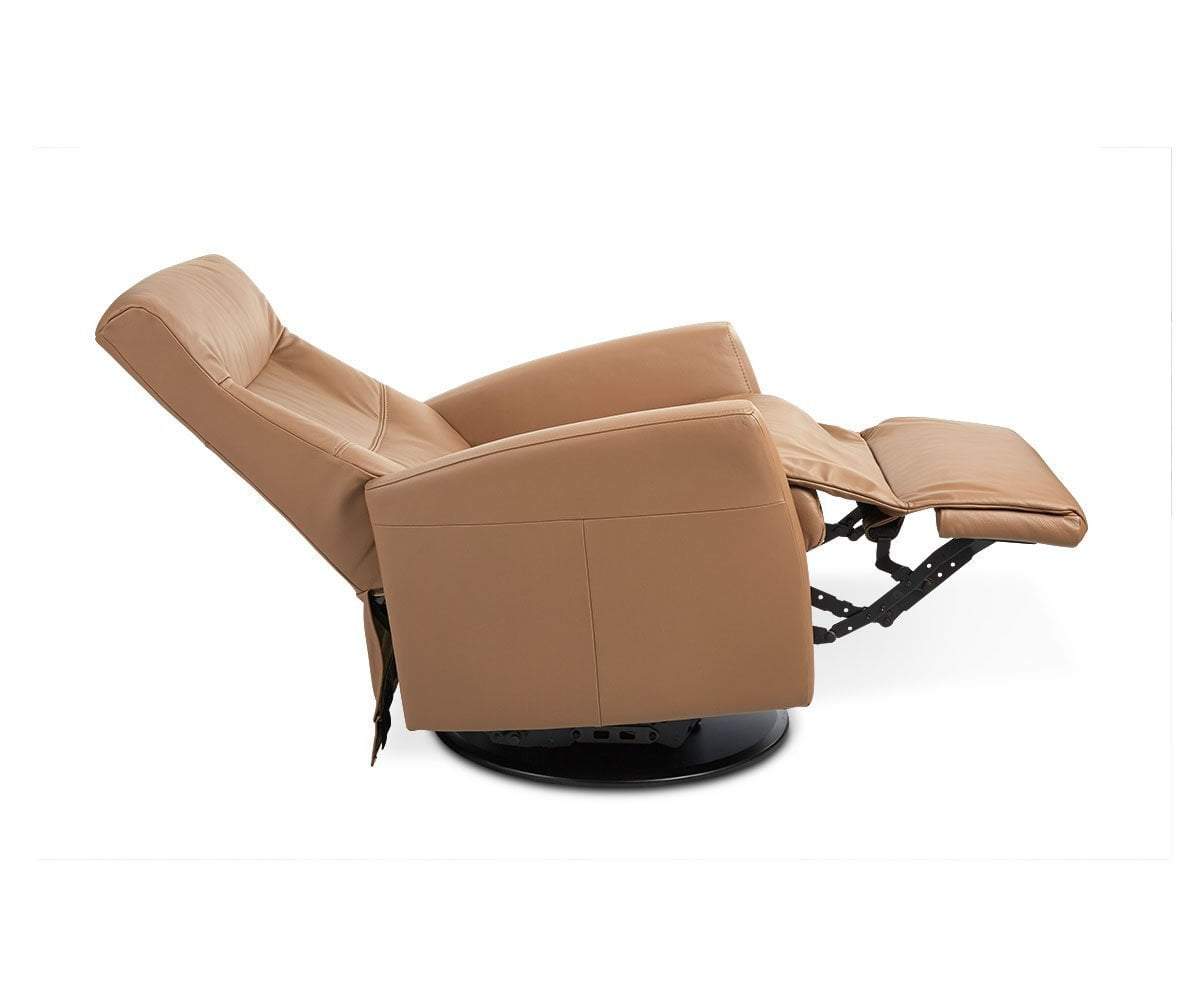 Establish your home comfort zone in grand style with the Hedvig manual recliner. Upholstered in fine leather, it provides full body support from head to toe while allowing you to swivel, glide, rock or recline to your heart’s content. You will find the lever for the reclining feature cleverly wrapped in matching upholstery and located inside the seat area. Designed with durability in mind, this chair will provide years and years of relaxation. Just settle in, put your feet up and unwind.