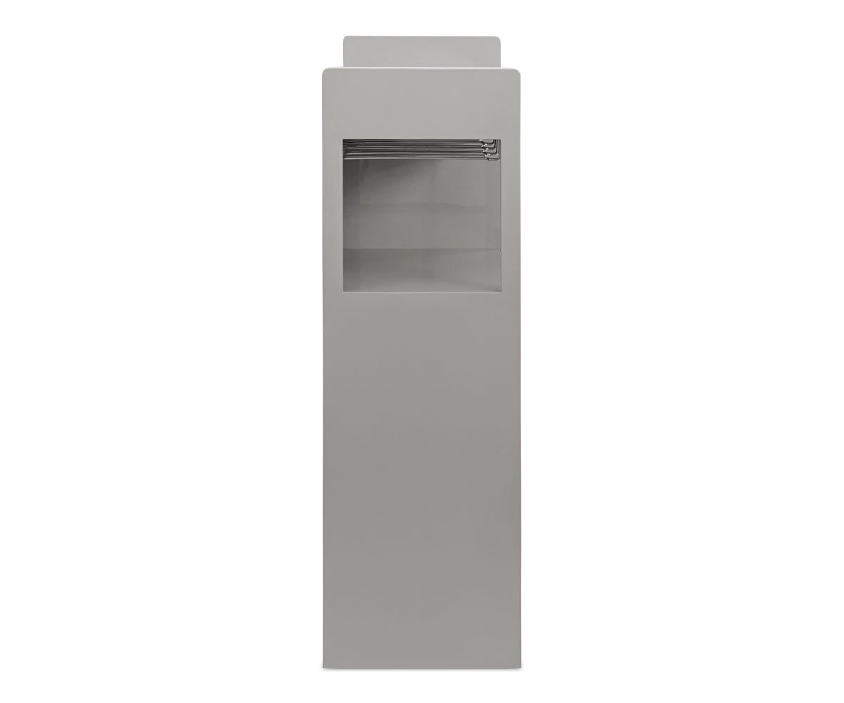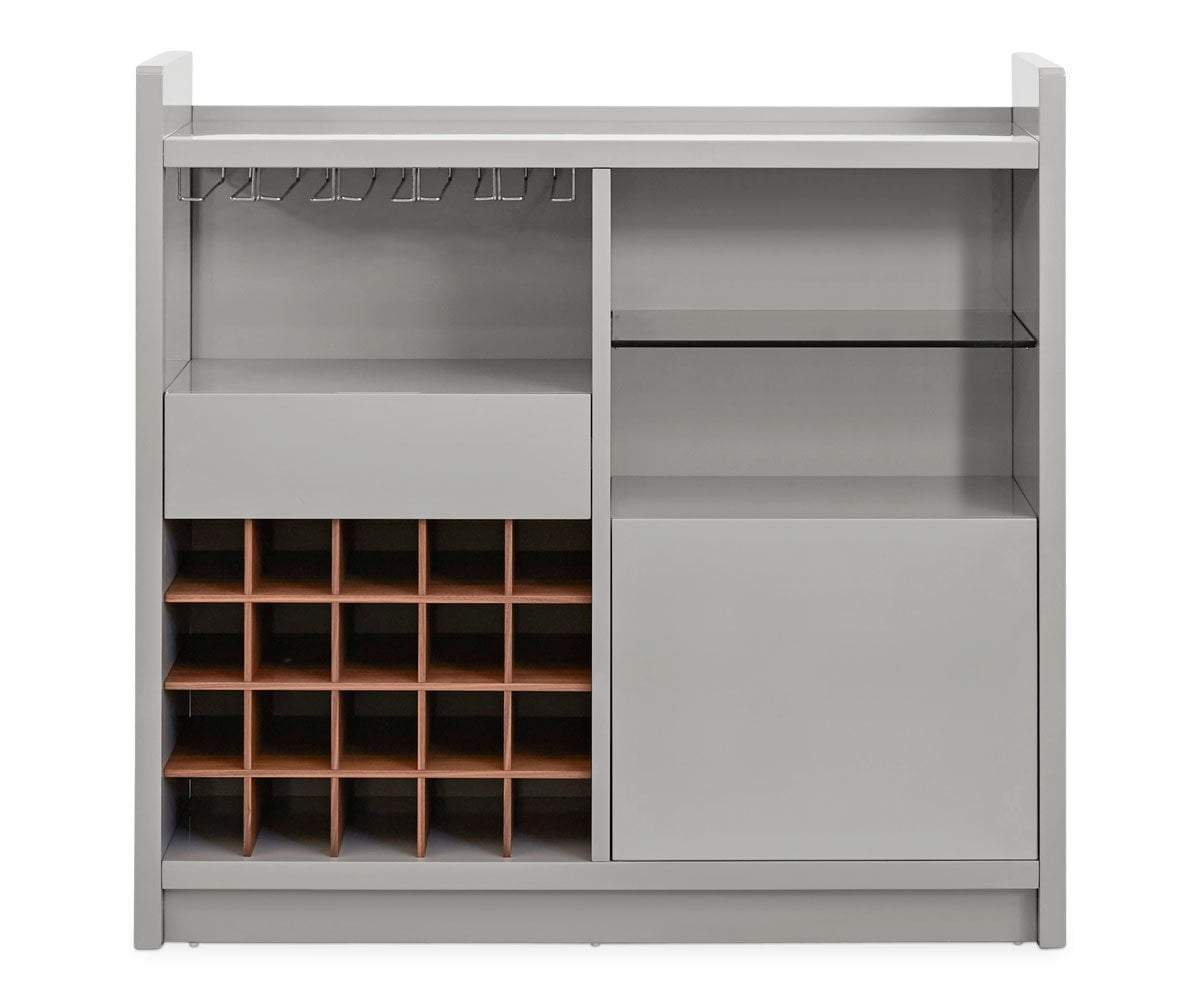 Entertain the crowd in style with the modern Hyva bar cabinet. This bold storage piece is ready to take on the spotlight with room for all of your bar essentials. Attention to detail is evident in the intriguing design. From the stainless steel hanging wine glass rack, to the enclosed twenty bottle wooden wine rack and glass display shelf, the mix of elements and their placement create balance.