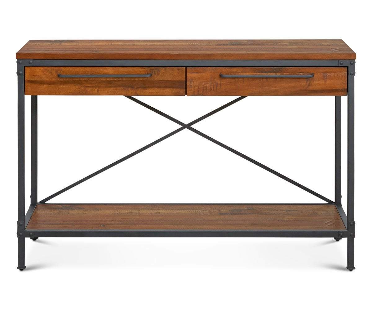 Expertly crafted from solid American poplar with a natural antique stain, the Insigna console table adds rustic industrial style to your space. The rich, modern aesthetic is completed with refined metal frame, legs and drawer pulls. Two large drawers feature smooth-glide runners.