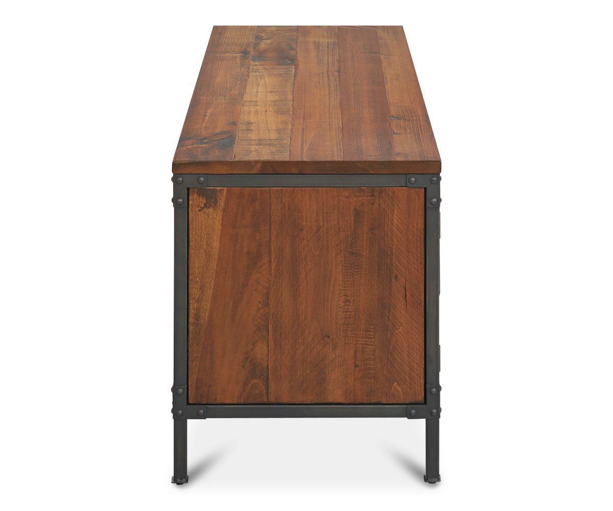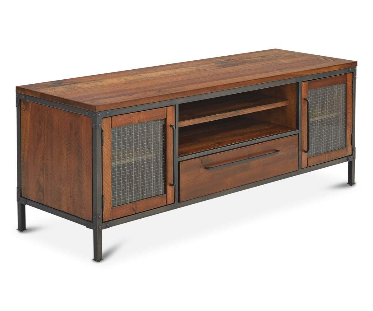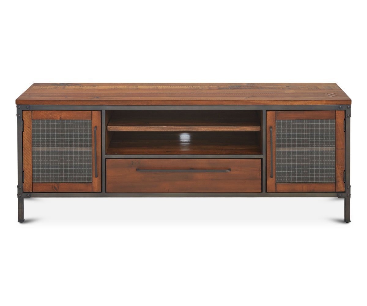Update your home entertainment area with the Insigna media stand. The mix of rustic and industrial elements offer high style as well as ample storage space with open shelves, one felt-lined drawer and two wire-front cabinets.