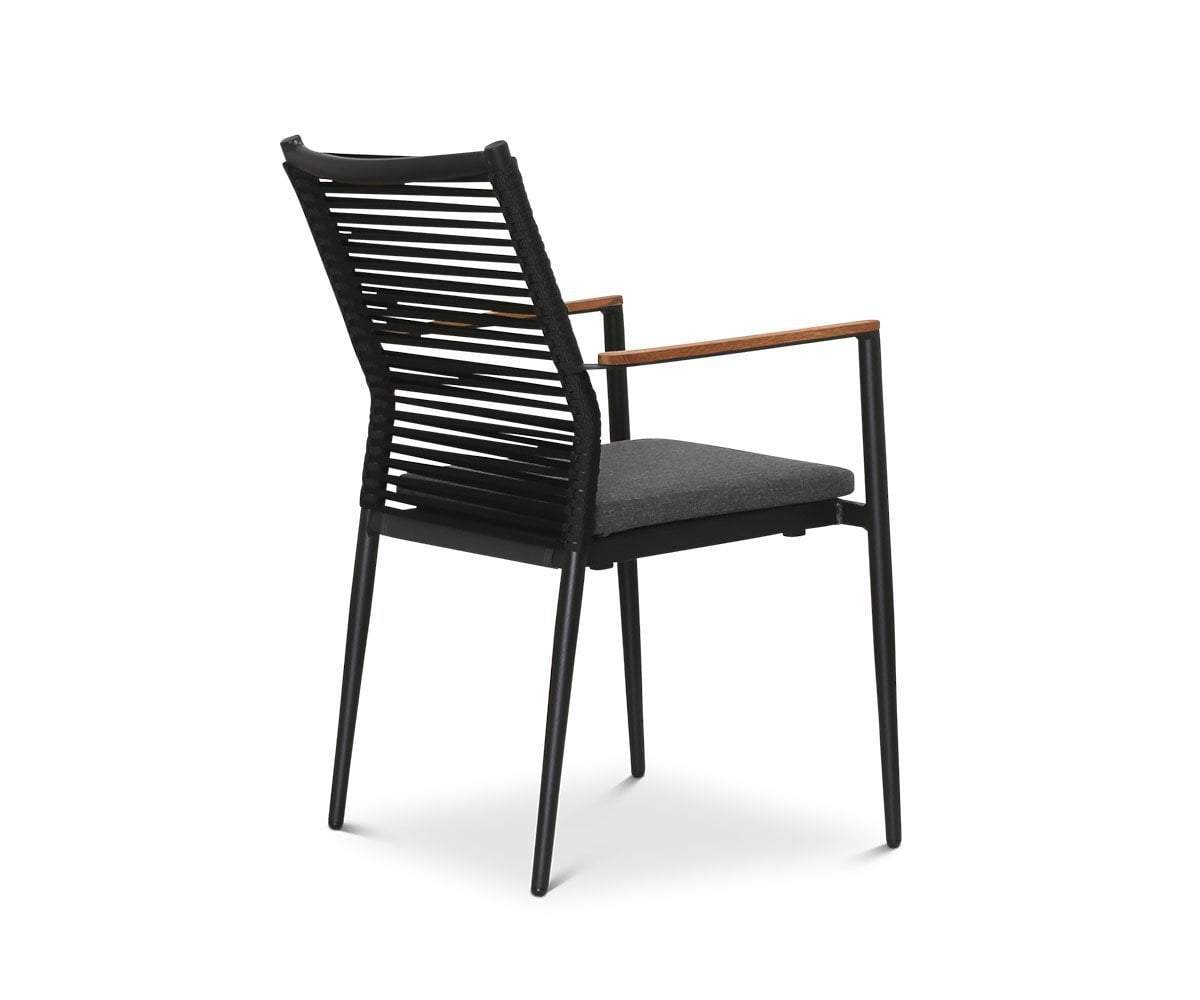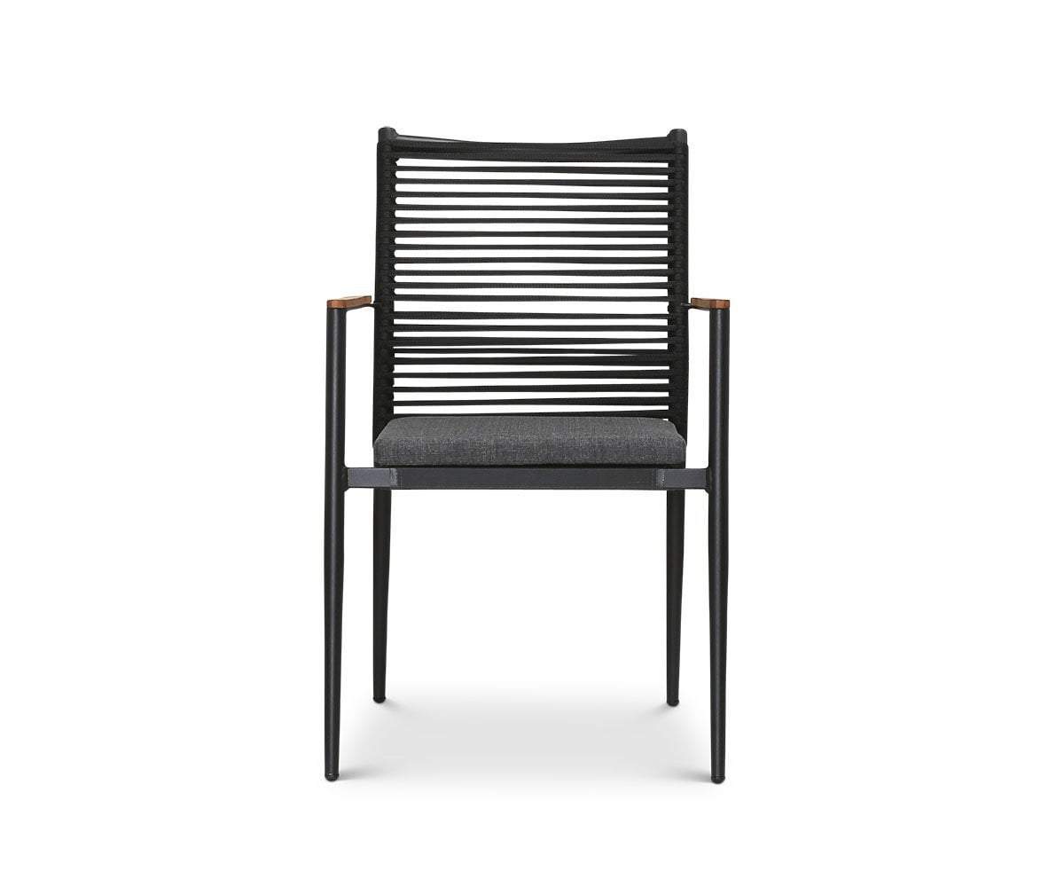 Sleek and contemporary, the Jaren dining chair plays well with other design styles. This ergonomic chair features high armrests, a slatted back rest for breathability and lumbar support. The aluminum frame has been powder-coated for all-weather durability, and the solid teak accents are naturally weather- and fade-resistant.