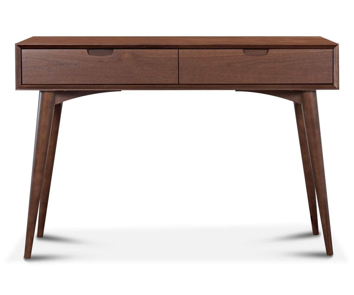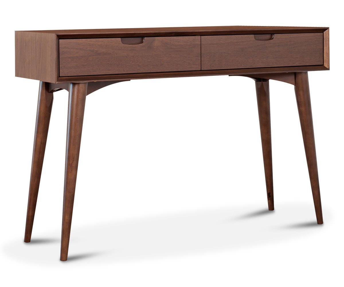 The Juneau console table commands attention with a mid-century feel featuring splayed tapered legs, boxy profile and two large drawers with French dove-tail joints.