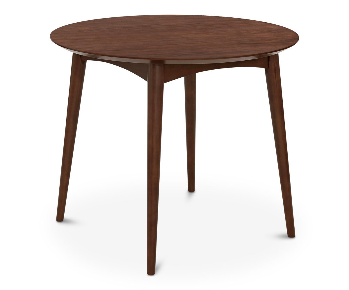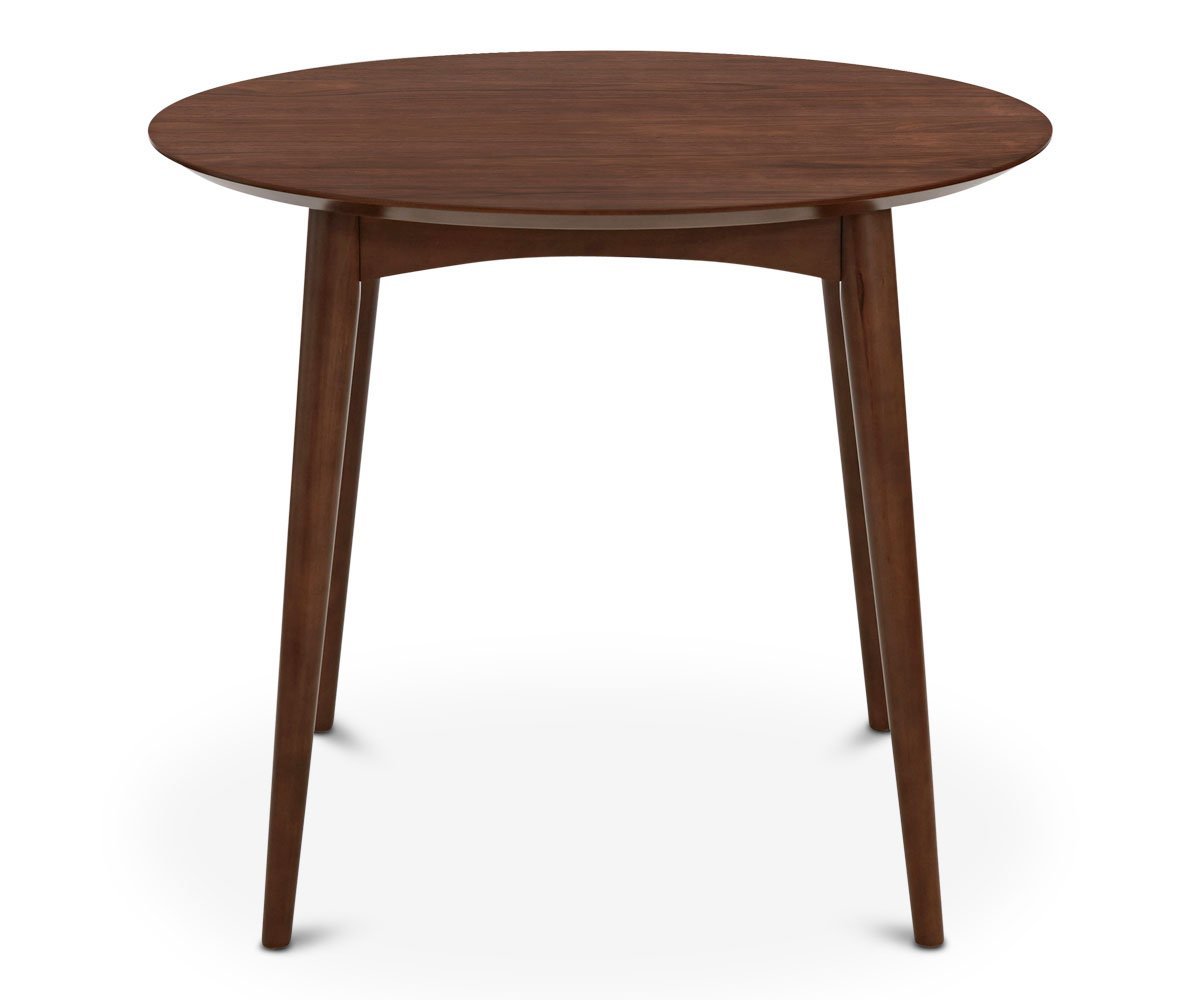 The Juneau round table is the embodiment of classic Scandinavian design made to enhance your dining area with polish and grace. Transcending design trends, it features a round tabletop with reverse-beveled edges elevated by elegantly angled and tapered legs in a deep, warm finish. Comfortably seating four, you will be poised for a pleasant dining experience.