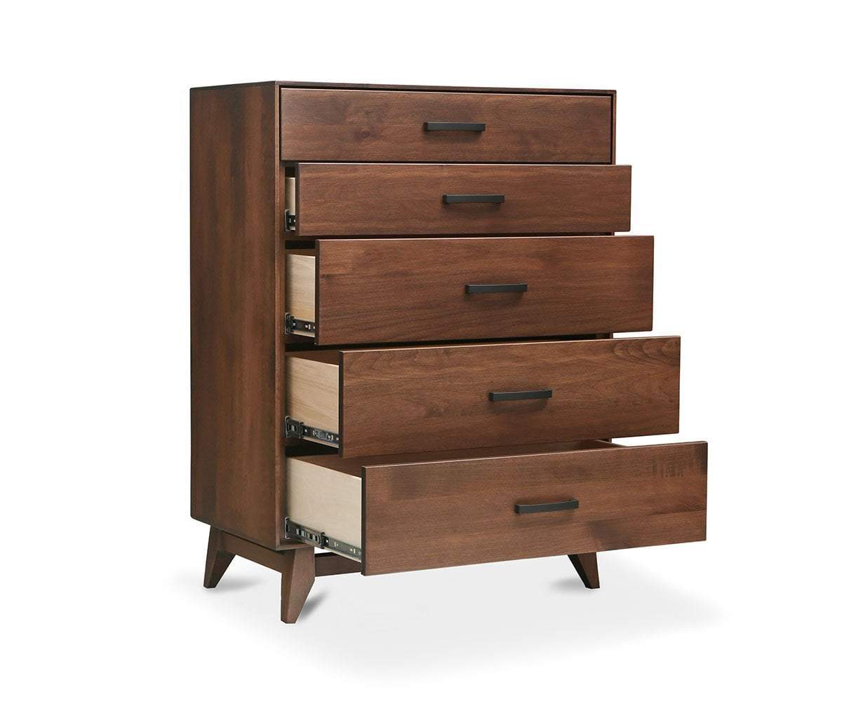 Made in the USA, the Kelby high chest stands proudly displaying mid-century modern design. Crafted of solid Oregon maple, the natural characteristics visible in the wood make each piece unique and lend to its organic beauty. The five drawers are finished with sleek, powder-coated metal handles to provide a subtle contrast against the overall warm tones. Tapered legs set at an angle, add the classic touch to this timeless bedroom storage piece.