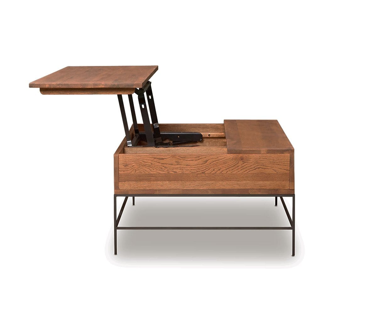 The Leende lift top storage coffee table allows you to clear clutter and hide away items such as remotes, magazine, games and blankets in refined rustic industrial style. This distinctive piece serves a dual purpose by becoming a raised table/desk surface at the lift of a finger. The main compartment features solid European oak and is supported on a sturdy steel base and legs.