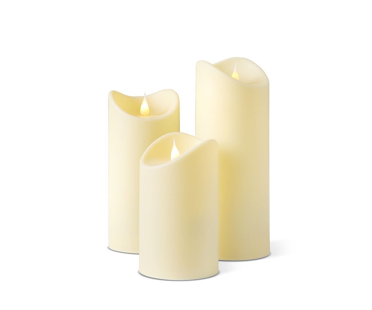 The realistic wick of the Lys outdoor flameless candles flickers and moves to create the perfect ambiance in your outdoor space without the worry of an open flame. Admire the warm glow that comes from this beautiful, water-resistant set of three pillar candles, each one in a different size. Enjoy the ease of these beautiful battery-operated additions to your decor by setting the automatic timer to 4 or 8 hours of light. For different hours of operation and to select the dimmer or flicker features, simply use the included remote control. Candles and remote control may also be purchased separately.